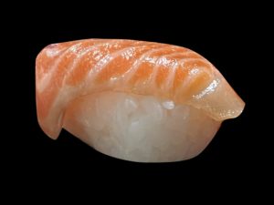 A seamless looping 3D animation of a single salmon sushi rotating smoothly in place. High-quality realistic 3D render, glossy fresh salmon texture with visible marbling, detailed rice grains, soft studio lighting, clean minimalist background, centered composition. Smooth continuous rotation, stable camera, perfectly looping